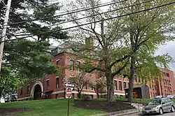 The former Varney School building is located southwest of downtown Manchester, on the south side of Varney Street at its junction with Bowman Street. It is a 2½-story red brick building, consisting of a cruciform main block, to which a wing has been added to the rear. It is covered by a slate hip roof and is trimmed in granite. The main facade has a central gabled bay, with the main entrance set in a large round-arch recess lined with wooden paneling. The gable has a half-round light at its center, and is surmounted by an open square belfry capped by a pyramidal roof and finial.[2]
