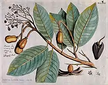 The inflorescence appears in axillary panicles densely clothed in stellate hairs. The flowers are white, fragrant, about 2 cm across, with 5 petals, about 40-50 stamens and yellow anthers,[7] with a columnar style that protrudes beyond the anthers.[8] The fruit is a 3-valved capsule, brown, and oblong or egg-shaped, about 6.4 x 3.8 cm in size. The base of the fruit has the persistent remains of the calyx with the 5 sepals curved back. The ovary is 3-celled, with 2 ovules in each cell,[9] but the fruit typically produces a single seed with large cotyledons.[4] The average weight of the mature fruit (±SE) is 72.6 (± 4.4) g; the fruit has a thick and hard pericarp and bulky cotyledons weighing about 13.2 (± 1.4) g.[10]