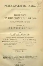 - ↑ Dymock, William; Hooper, David; Warden, C. J. H. (1890). Pharmacographia indica ?A history of the principal drugs of vegetable origin, met with in British India /By William Dymock ... C. J. H. Warden ... and David Hooper. Missouri Botanical Garden. London : K. Paul, Trench, Tru?bner & co., ld; [etc. etc.]