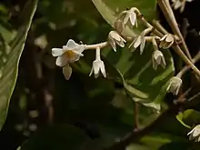 Vateria indica is bee-pollinated.[8] Vateria indica trees in Sringeri in the central Western Ghats flower profusely from late January to early May. The trees flower in alternate years with a mast event occurring every fourth year.[10] The flowers, which open during the day and last only one day, attract generalist nectarivores and pollinators. They are regularly visited by social bees such as Asian honey bee and giant honey bee, and more occasionally by other bees such as Lasioglossum, Ceratina, Tetragonula iridipennis, Xylocopa latipes, Xylocopa rufescens, and Xylocopa verticalis.[10]