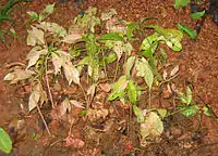 The trees mainly fruit during the south-west monsoon months between July and September, with fruit fall occurring during periods of downpour towards the end of the monsoon. On the trees, fruits may sometimes show an emerged radicle, indicating vivipary. There is no dormancy as the seeds germinate within 1 to 6 days after they fall, retaining the bulky cotyledons for over one week.[10] A study in Sringeri forests, found that seed germination and seedling growth is affected by seed predators and insect herbivores, particularly the latter. In this area, about 91% fruits were attacked by a curculionid weevil and a scolytid beetle (a borer), with eggs, larvae, pupae, and adults of both predators seen in infected fruits.[10] Nevertheless, seed predation, as determined by damage to the growing plumule was low, seen in only 11% of fruits. The weevil was mainly found in the fibrous pericarp about half the time or in the cotyledons (37%), and less often (13%) in the plumule. The scolytid borer mostly targeted the cotyledon (97%) and minimally affected (3%) the fruit pericarp. While cotyledon attacks did not kill seedlings, plumule-infestation led to mortality of seedlings.[10] Insect herbivores killed around 45% of the seedlings. Two species of sap-sucking ants (Pheidole and Pheidolegeton), a leaf-miner of the Dipteran fly family Tipulidae, and the larvae of a Lymantrid moth were the main seedling herbivores, with herbivory by the latter two taxa (leaf miner and moth) often leading to seedling mortality. No vertebrate seed predators or dispersers have been recorded[10]