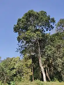 Low-elevation wet forests of the Western Ghats tend to be dominated by dipterocarps, particularly Vateria indica and Dipterocarpus indicus. In the Uppangala forest (300 – 600 m elevation) in Karnataka, Vateria indica is the dominant tree accounting for about 17% of the trees and 29% of the basal area, followed by other species such as Myristica dactyloides, Humboldtia brunonis, and Dipterocarpus indicus.[18]