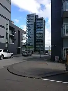 Vatnsstígur 16–18 is a residential tower located in downtown Reykjavík, Iceland. It is a part of a larger project called "shadow district" (Icelandic: Skuggahverfi) under phase 2.[1] This tower is the tallest residential tower in Reykjavík, standing 69.35 m (227.5 ft) tall.[2] Construction of phase 2 was delayed due to the financial crisis in 2008, and therefore was not completed on schedule.