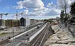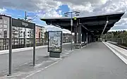 The station opened in April 2019,[3] and was built in conjunction with the development of the surrounding area. It is located between the stations Skogås and Handen, and has a central island platform. The ticket hall is located at the southern end of the station and preparations have been made for an entrance also at the northern end.