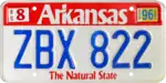 Embossed blue serial on reflective white plate; red band screened at top containing "Arkansas" in white in the center | "The Natural State" screened in red centered at bottom | ABC 123 | POR 001 to approximately ZWO 999 | |