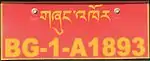 The Royal Government of Bhutan vehicles in Bhutan use a red license plate with the letters written in yellow. The first two characters of the plate are BG, followed by the same sequence as in case of private vehicles.