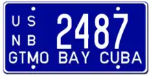 Cars of the United States military in the Guantanamo Bay use licence plates with one letter and four numbers, and texts "U.S.N.B." and "Gtmo Bay Cuba".