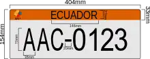 The plates are 154 mm high and 404 mm wide and are reflective in order to improve their visibility. The unique letter-number combination consists of three letters followed by three or four digits ranging from 000 to 9999. Formats in use are ABC-123 (old format) and ABC-1234 (new format). The word "Ecuador" appears in uppercase letters at the top of the plate.