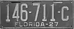 1927 | Embossed white serial on black plate with border line; "FLORIDA-27" centered at bottom | none | 123-456-C | 1-C to approximately 409-000-C | First use of the full state name. |