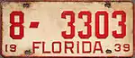 1939 | Embossed red serial on white plate with border line; "FLORIDA" centered at bottom; "19" at bottom left and "39" at bottom right | none | 1T-1234 10T-123 1-12345 10-1234 1D12345 10D1234 1W-1234 10W-123 |