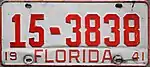 1941 | Embossed red serial on white plate with border line; "FLORIDA" centered at bottom; "19" at bottom left and "41" at bottom right | none | 1T-123 10T-123 1-12345 10-1234 1D12345 10D1234 1W-1234 10W-123 |
