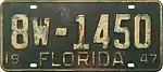 1947 | Embossed white serial on forest green plate with border line; "FLORIDA" centered at bottom; "19" at bottom left and "47" at bottom right | none | 1T-123 10T-123 1-1234 10-123 1D12345 10D1234 1W12345 10W1234 1WW-123 10WW123 |