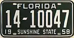 1958 | Embossed white serial on dark green plate with border line; "FLORIDA" centered at top; "19" at bottom left and "58" at bottom right | "SUNSHINE STATE" centered at bottom | 1T-12345 10T-1234 1D-1234 10D-1234 1-123456 10-12345 1W123456 10W12345 1WW-1234 10WW1234 |