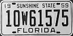 1959 | Embossed dark green serial on white plate with border line; "FLORIDA" centered at bottom; "19" at top left and "59" at top right | "SUNSHINE STATE" centered at top | 1T-12345 10T-1234 1D-1234 10D-1234 1-123456 10-12345 1W123456 10W12345 1WW12345 10WW1234 |