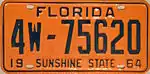 January 1964 – January 1965 | Embossed blue serial on orange plate with border line; "FLORIDA" centered at top; "19" at bottom left and "64" at bottom right | "SUNSHINE STATE" centered at bottom | 1D-12345 10D12345 1-123456 10-12345 1W123456 10W12345 1WW12345 10WW1234 10W/W12345 |