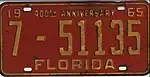 February 1965 – February 1966 | Embossed gold serial on red plate with border line; "FLORIDA" centered at bottom; "19" at top left and "65" at top right | "400TH ANNIVERSARY" centered at top | 1D-12345 10D12345 1-123456 10-12345 1W123456 10W12345 1WW12345 10WW1234 10W/W12345 |