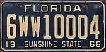 March 1966 – March 1967 | Embossed white serial on blue plate with border line; "FLORIDA" centered at top; "19" at bottom left and "66" at bottom right | "SUNSHINE STATE" centered at bottom | 1D-12345 10D12345 1-123456 10-12345 1W123456 10W12345 10/W-123456 1WW12345 10WW1234 10W/W12345 |