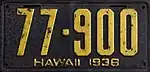 1938 | Embossed yellow on black; "HAWAII 1938" centered at bottom | 12-345 | Issued in blocks by county | |