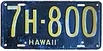 1940 | Embossed black on yellow; "HAWAII 1940" at bottom, offset to right | A/A1234 | County-coded (see right) | Honolulu County used O as the second letter and numbers 5000–9999; Hawaii County used H and numbers 2000–2999; Maui County used M and numbers 3000–3999; and Kauai County used K and numbers 4000–4999. The number allocations were used through 1950.[1] |