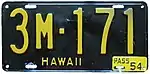1953–56 | Embossed golden yellow on black; "HAWAII" at bottom, offset to left | none | 1A-123 A-123 A-1234 1A-1234 |
