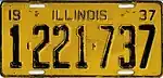 1937 | Black on yellow with border line; "19 - ILLINOIS - 37" at top | none | 1-234-567 | 1 to approximately 1-569-000 | |