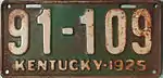 1925 Embossed white serial on green plate with border line; "KENTUCKY·1925" centered at bottom none 123-456 First use of the full state name.