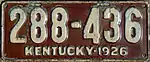 1926 Embossed white serial on maroon plate with border line; "KENTUCKY·1926" centered at bottom none 123-456