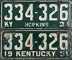 1931 Embossed white serial on green plate with border line; "19 KENTUCKY 31" (on front plates) or "KY", county name and "31" (on rear plates) at bottom none 123-456 1 to 850-000
