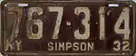 1932 Embossed white serial on maroon plate with border line; "19 KENTUCKY 32" (on front plates) or "KY", county name and "32" (on rear plates) at bottom none 123-456 1 to 850-000