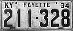 1934 Embossed black serial on white plate with border line; "KY", county name and "34" at top none 123-456 1 to 850-000