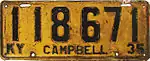 1935 Embossed black serial on yellow plate with border line; "KY", county name and "35" at bottom none 123-456 1 to 850-000