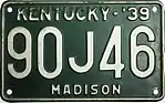 1939 Embossed white serial on green plate with border line; "KENTUCKY-'39" and county name centered at top and bottom respectively none 12345
