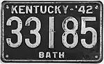 1942–43 Embossed silver serial on black plate with border line; "KENTUCKY-'42" and county name centered at top and bottom respectively none 12345