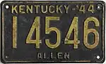 1944–45 Embossed yellow serial on black plate with border line; "KENTUCKY-'44" and county name centered at top and bottom respectively none 12345