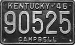 1946–47 Embossed silver serial on black plate with border line; "KENTUCKY-'46" and county name centered at top and bottom respectively none 123-456 Issued in blocks by county Revalidated for 1947 with windshield stickers.