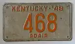 1948 Embossed orange serial on unpainted aluminum plate; "KENTUCKY-'48" and county name centered at top and bottom respectively none 123-456 Issued in blocks by county