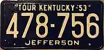 1953 Embossed white serial on dark blue plate; county name centered at bottom "TOUR KENTUCKY-'53" centered at top 123-456 Issued in blocks by county
