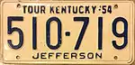 1954 Embossed dark blue serial on white plate; county name centered at bottom "TOUR KENTUCKY-'54" centered at top 123-456 Issued in blocks by county