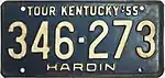 1955 Embossed white serial on dark blue plate; county name centered at bottom "TOUR KENTUCKY-'55" centered at top 123-456 Issued in blocks by county