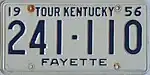 1956 Embossed dark blue serial on white plate; "19" at top left and "56" at top right; county name centered at bottom "TOUR KENTUCKY" centered at top 123-456 Issued in blocks by county