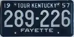 1957 Embossed white serial on dark blue plate; "19" at top left and "57" at top right; county name centered at bottom "TOUR KENTUCKY" centered at top 123-456