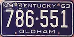 1963 Embossed white serial on dark blue plate with border line; "19 KENTUCKY 63" at top; county name centered at bottom none 123-456