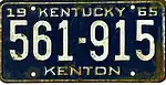 1964 Embossed dark blue serial on white plate with border line; "19 KENTUCKY 64" at top; county name centered at bottom none 123-456