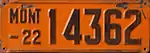 1922 | Embossed black serial on orange plate; "MONT –22" at left | none | 12345 | 1 to approximately 55000 | |