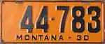 1928 | Embossed black serial on orange plate with border line; "MONTANA–28" centered at bottom | none | 123-456 | 1 to approximately 103-000 | First use of the full state name. |