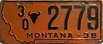 1938 | Embossed black serial with buffalo skull separator on orange plate with state-shaped border; "MONTANA–38" below serial | none | 1-12345 1/0-1234 |