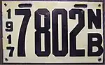 1917 | Black serial on light yellow porcelain plate; vertical "1917" and "NB" at left and right respectively | none | 1234 | 3000 to approximately 8300 | |