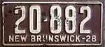 1928 | Embossed white serial on maroon plate with border line; "NEW BRUNSWICK-28" at bottom | none | 12-345 | 3-000 to approximately 28-500 | First use of the full province name. |