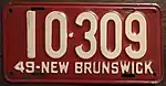 1949 | Embossed white serial on maroon plate; "49-NEW BRUNSWICK" at bottom | none | 12·345 | 1·000 to approximately 46·500 | |
