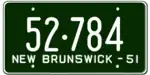 1951 | Embossed white serial on green plate with border line; "NEW BRUNSWICK – 51" at bottom | none | 12·345 | 1·000 to approximately 58·000 | |
